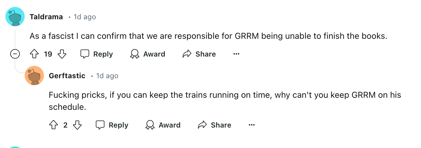 9 thoughts on “George R. R. Martin Can’t Finish “Winds” Because…Fascism, I Guess”